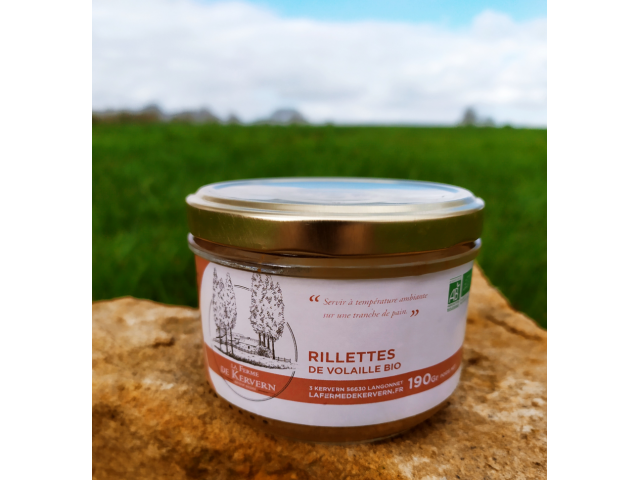 Viande de volaille* 55 %, gras de porc*, oignons*, sel de Guérande, poivre noir*, thym*, laurier*